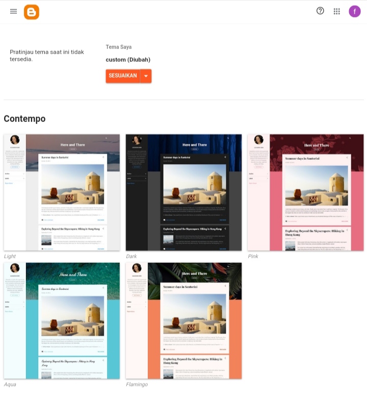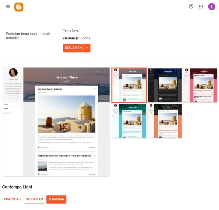 Klik pada menu 'Tema' seperti pada gambar diatas, maka kalain akan menuju halaman seperti dibawah ini.Ada banyak tema yang diberikan oleh blogger secara gratis seperti :- Contempo (5)